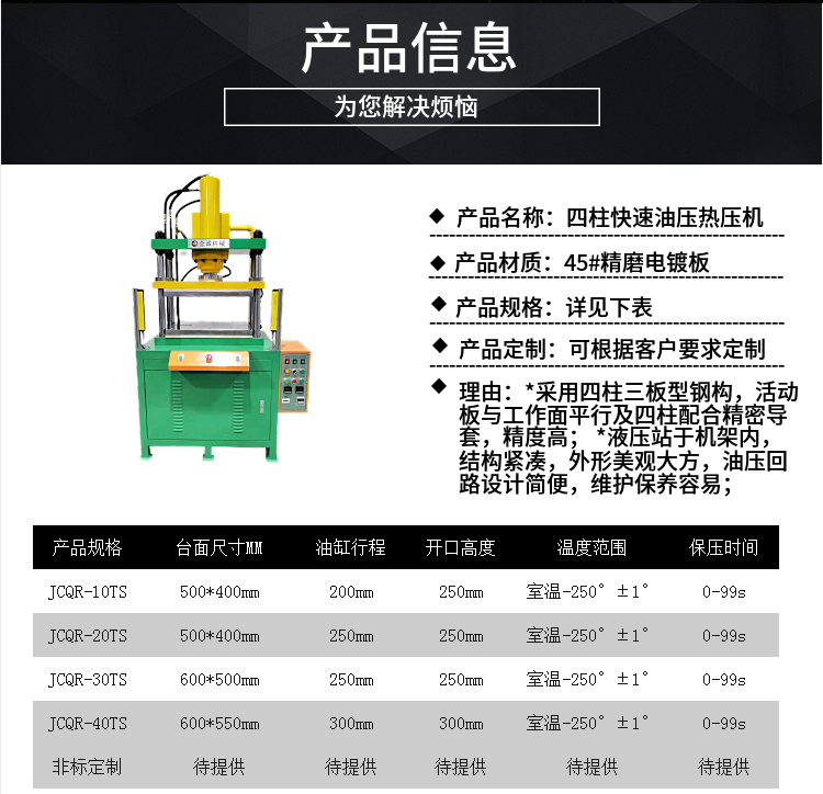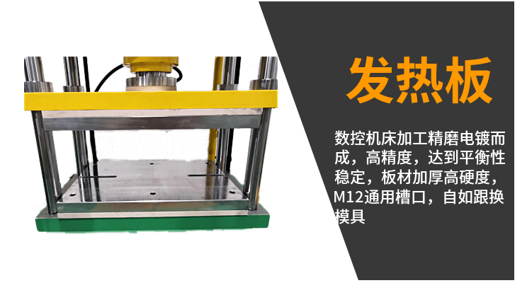 1.特點:*薄膜(mó)開關、喇(lǎ)叭膠膜等凹(āo)凸麵熱衝壓成型; *塑料粒壓薄片測試、薄膠片熱粘合壓接; *適用於大麵積(jī)熱成型產品的生產(chǎn)使用。 2.參數:*采用四柱三板型鋼構,活動板與工作麵平行及