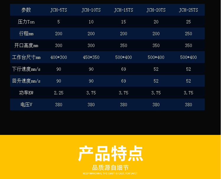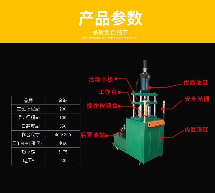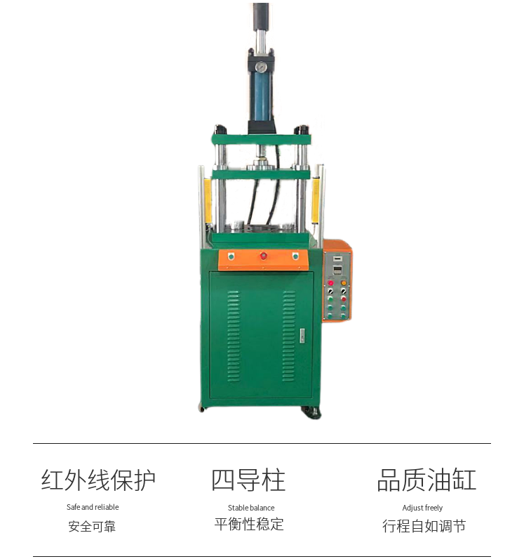 2.采用四柱三板型鋼構(gòu),精度高,剛性好,抗壓強度高; 3. *油壓回路設計簡便,馬力需求小,維護保養容易; 4.*壓力、行程、速度、加壓時間均可按產品要求調整; 5.*采用(yòng)台灣日本液(yè)壓元
