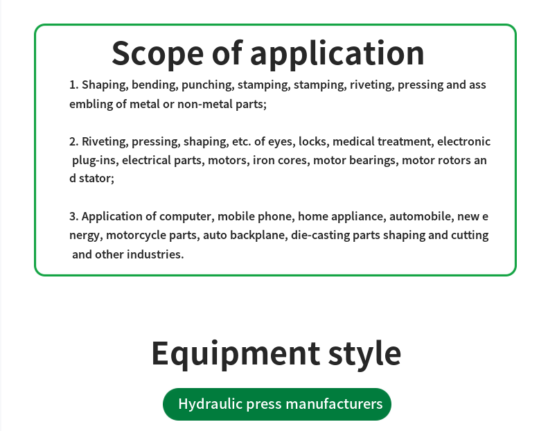 1. 金屬衝壓成型:可用於金屬材料的拉伸、衝裁、彎曲、翻邊、冷擠壓等各種衝壓工藝,如汽車零部件、家用電器、廚房用具等行(háng)業中金屬薄板(bǎn)零件的加(jiā)工。